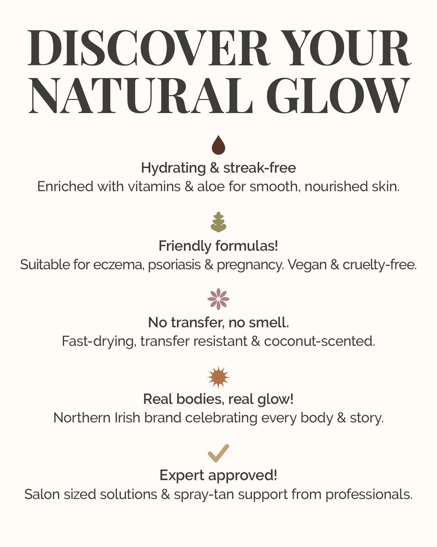 All our tans are made with brown-based tones, carefully designed to suit every skin tone. This gives a luxurious, natural looking finish with no orange, tan mess - just a flawless glow that looks like you’ve stepped off a plane.